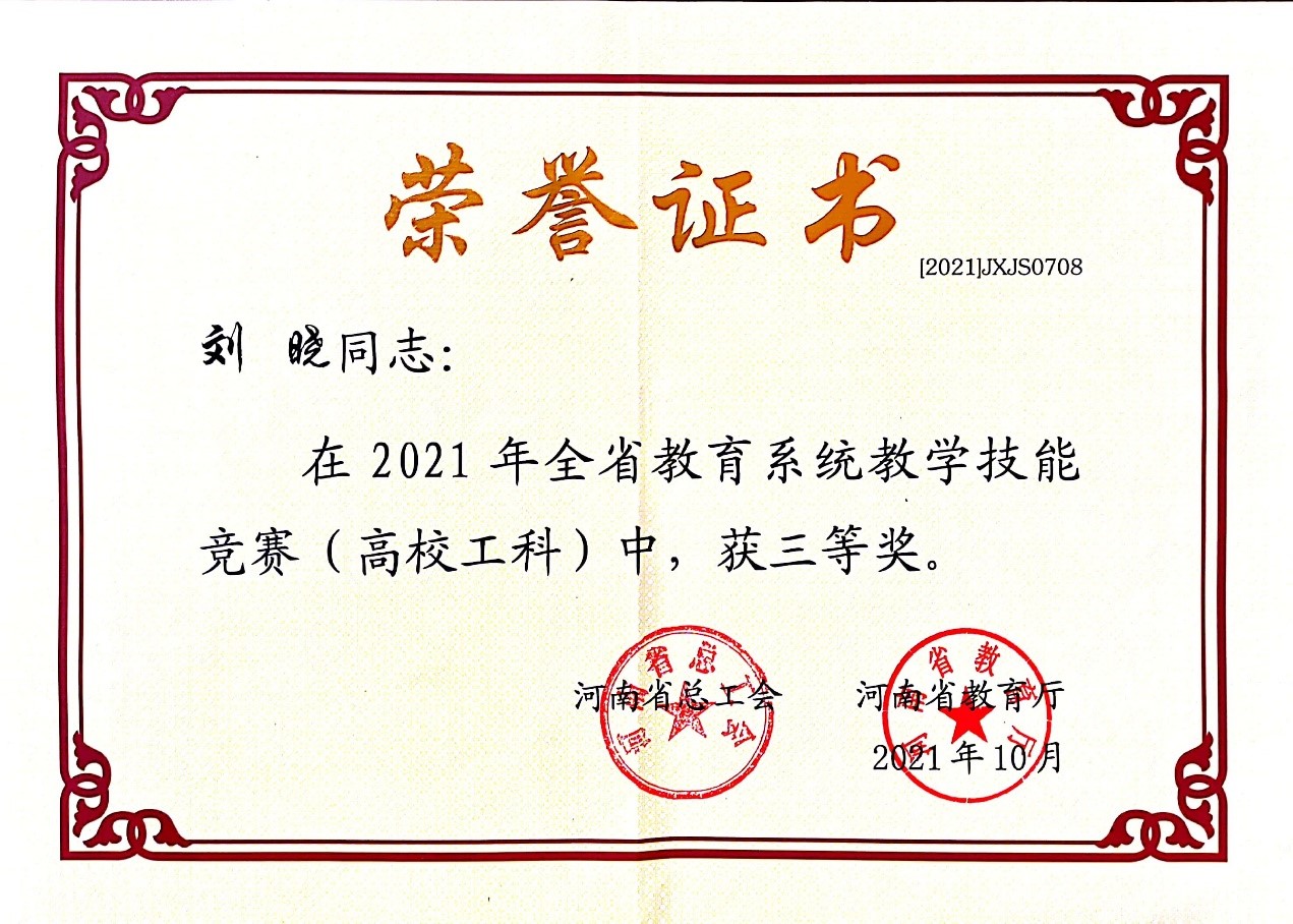 近日,河南省总工会、河南省教育厅公布了《关于表彰2021年全省教学技能竞赛获奖单位和个人的决定》,公司杜锋副教授、刘晓副教授在大学工科组中,分获二等奖和三等奖,这是公司在河南省教育系统教学技能竞赛中又一次获奖。