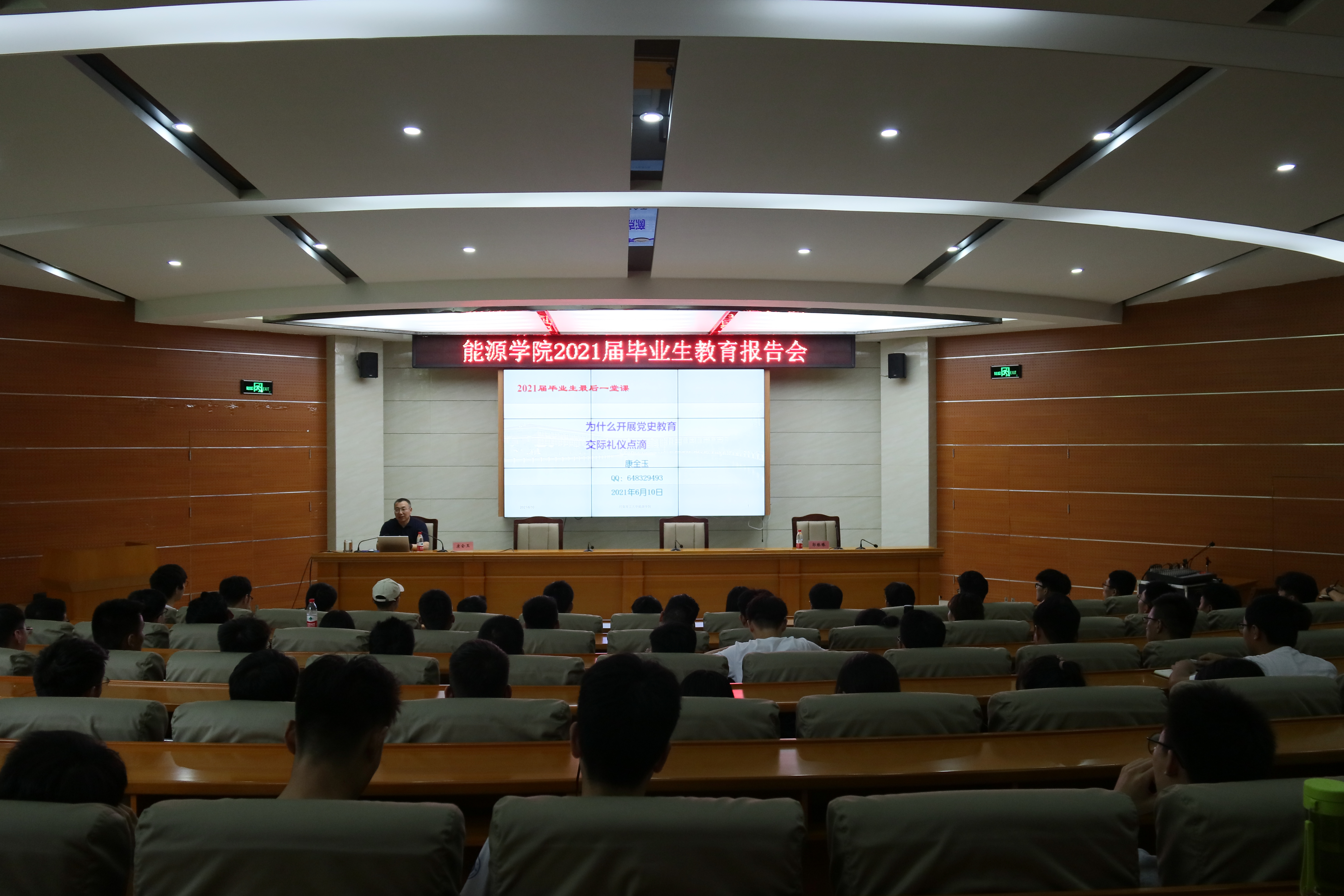 6月10日下午,学院在院楼104学术报告厅举办了2021届毕业生主题教育报告会,学公司党委书记康全玉、副经理李东印、学工办主任郭臻臻、辅导员岳帅帅、封静出席,毕业生全体党员及员工干部代表参加报告会。