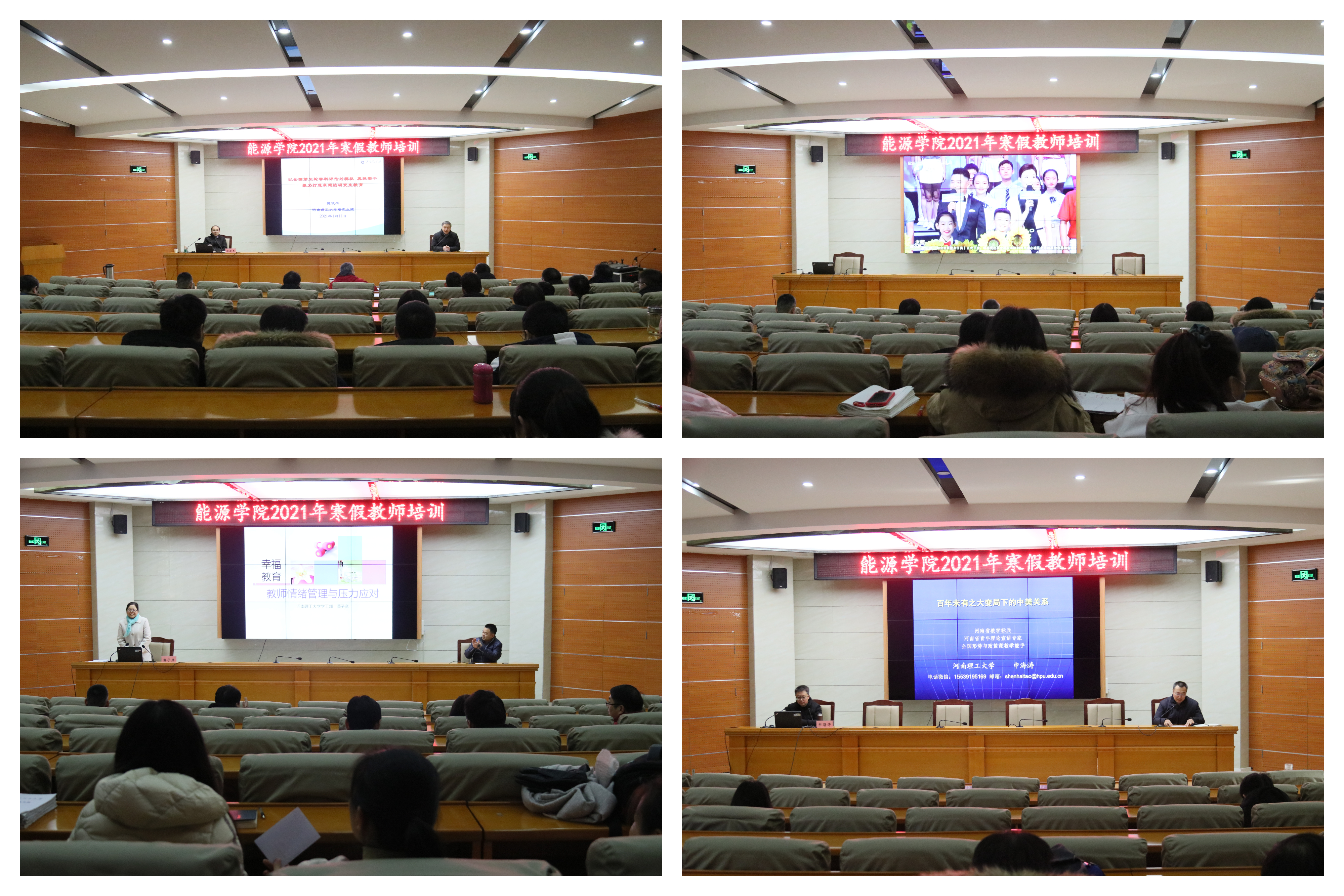 培训为期两天,共分为四个单位进行。11日上午,研究生院副经理陈俊杰作了题为《基于第五轮学科评估指标体系,浅析矿业工程博士授权学科的建设与发展》的报告,结合第五轮学科评估指标体系的解读,分析了矿业工程团队建设中需要重视的问题,指明未来发展的方向。11日下午,全体老师集中观看《出彩河南人 2020最美教师发布仪式》。发布仪式上隆表彰了12位河南最美教师,彰显了河南教师群体这支“铁军”的光辉形象,讴歌了河南教师为抗疫舍生忘死的家国情怀和爱岗敬业、无私奉献的崇高精神和为乡村教育事业无私奉献的美好心灵。12日上午,员工工作处思想教育科科长潘子彦作了题为《教师情绪管理与压力应对》的报告,讲解了教师工作生活遇到压力如何合理排解,科学面对心理健康问题。12日下午,马克思主义学院教师申海涛作了题为《百年未有之大变局之下的中美关系》的报告,慷慨激昂、幽默风趣、深入浅出的为大家带来了一场知识盛宴。