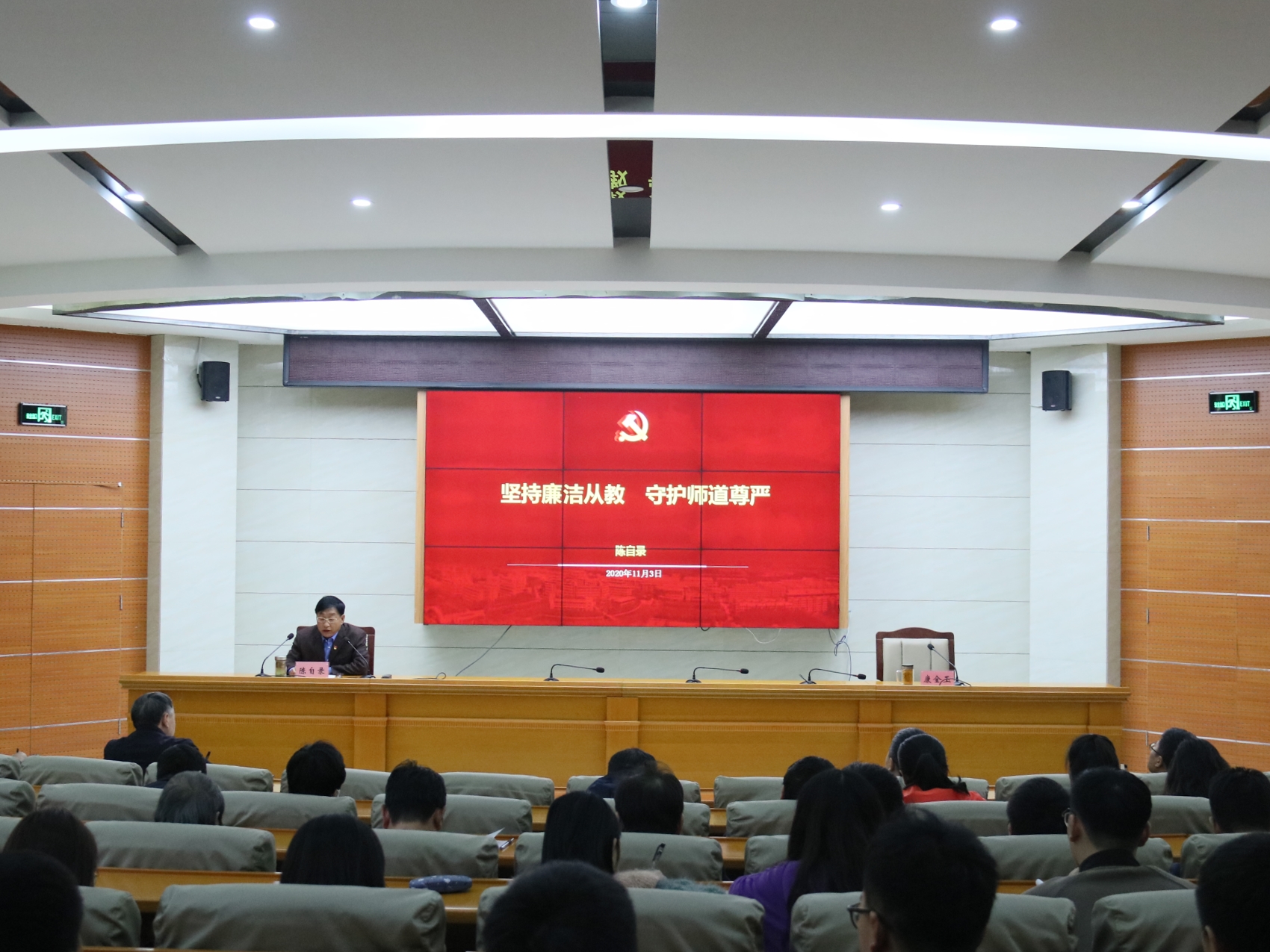 为扎实开展廉洁教育,深入加强师德师风建设,11月3日下午,校纪委书记(监察专员)陈自录莅临J9集团官网,以《坚持廉洁从教,守护师道尊严》为题作专题报告。学院教师及研究生党员130余人参加,报告会由党委书记康全玉主持。