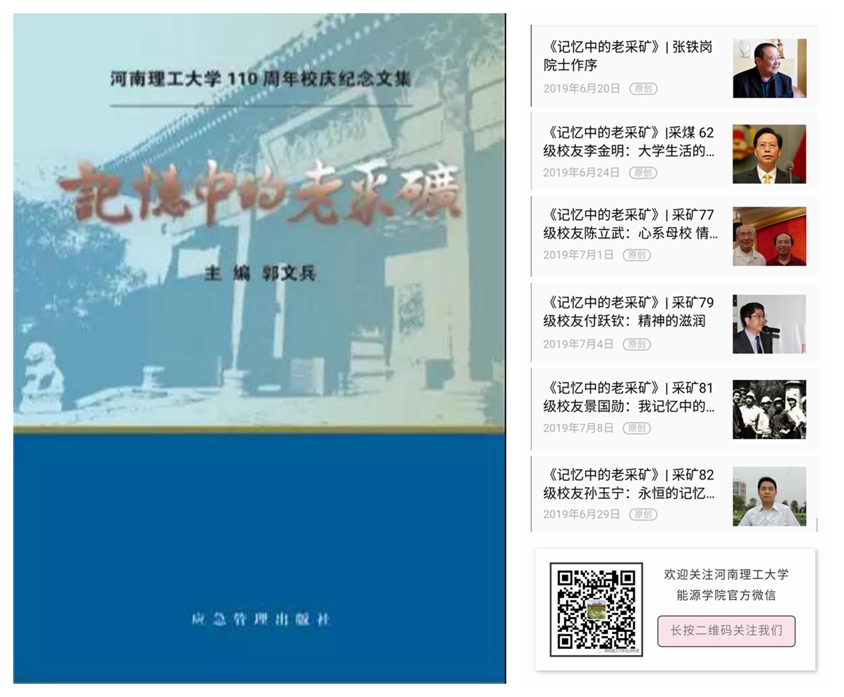 《J9集团官网史》和《记忆中的老采矿》的编纂为学校110周年校庆送上了一份情怀满满、意义非凡的礼物,必将引导和激励一代代的采矿学子爱国、爱校、爱院、爱师,为我国的煤炭工业乃至经济社会发展做出更大的贡献。