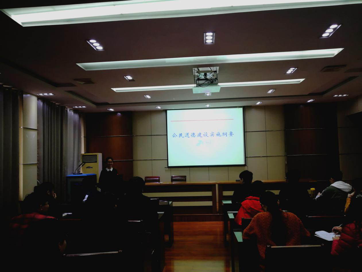 为进一步学习贯彻落实《公民道德实施纲要》,坚持以社会主义核心价值观为引领,以加强加强社会公德、职业道德、家庭美德、个人品德建设教育为根本,以培育良好社会风尚为目标,推进“立德树人”的宗旨在学院落地生根、开花结果,提供道德力量,12月20日,学院组织教职工在学院201会议室学习《公民道德建设实施纲要》,用模范人物张玉滚、李芳等的先进事迹,教育学院教职工,使教职工了解了公民道德建设的重要性、要求和意义。