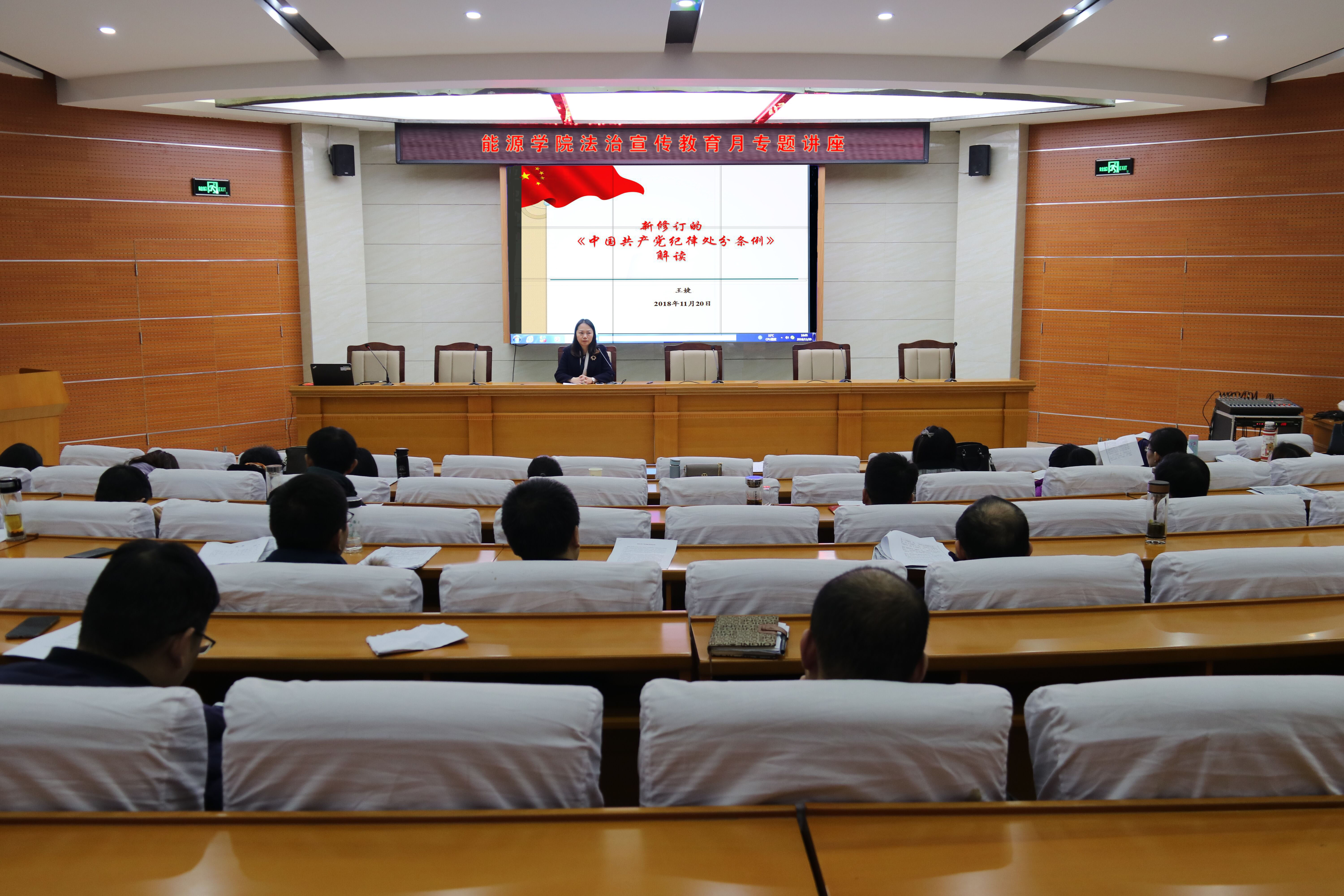 11月20日下午,学院在104学术报告厅开展法治宣传教育专题讲座,公司党委书记王婕带领全体教工党员集中学习新修订的《中国共产党纪律处分条例》。