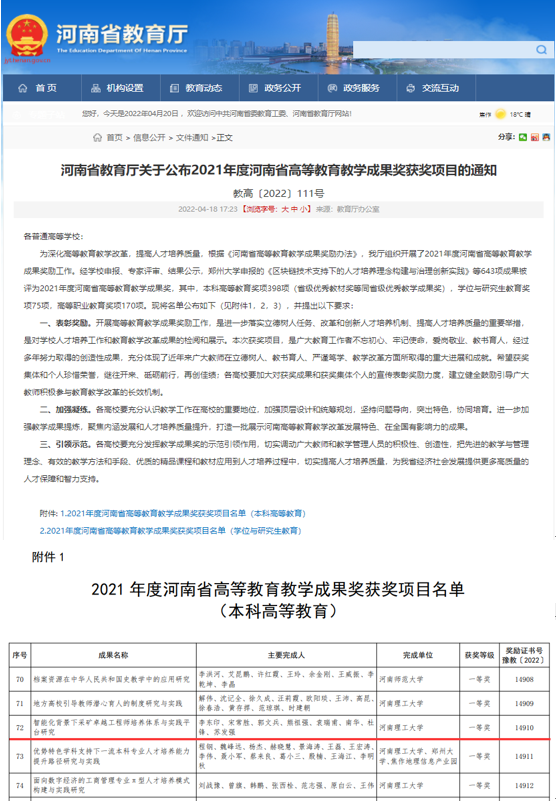 根据《河南省教育厅关于公布2021年度河南省高等公司产品成果奖获奖项目的通知》(教高〔2022〕111号)文件通知,公司李东印教授主持的《智能化背景下采矿卓越工程师培养体系与实践平台研究》获河南省高等公司产品成果奖一等奖。