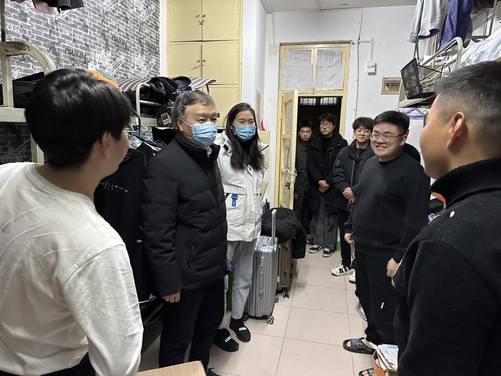 康全玉每到一间宿舍,都与同学们亲切交谈。他详细了解了同学们的身体健康状况和宿舍通风卫生情况,叮嘱大家“阳康”之后要适度锻炼,增强身体抵抗力,注意日常个人健康和公共卫生,加强宿舍开窗通风,养成良好的生活习惯。同时提醒同学们认真复习,在即将到来的考试中取得自己满意的成绩。郭文兵主要与高年级员工进行了交谈。他回顾了19级同学几经波折的考研过程,了解了同学们的考研情况,表示会和同学们一起期待最后的结果。他强调了毕业实习的重要性,希望高年级同学珍惜实习机会,深入了解生产现场的具体情况,将所学知识充分应用于实践中。